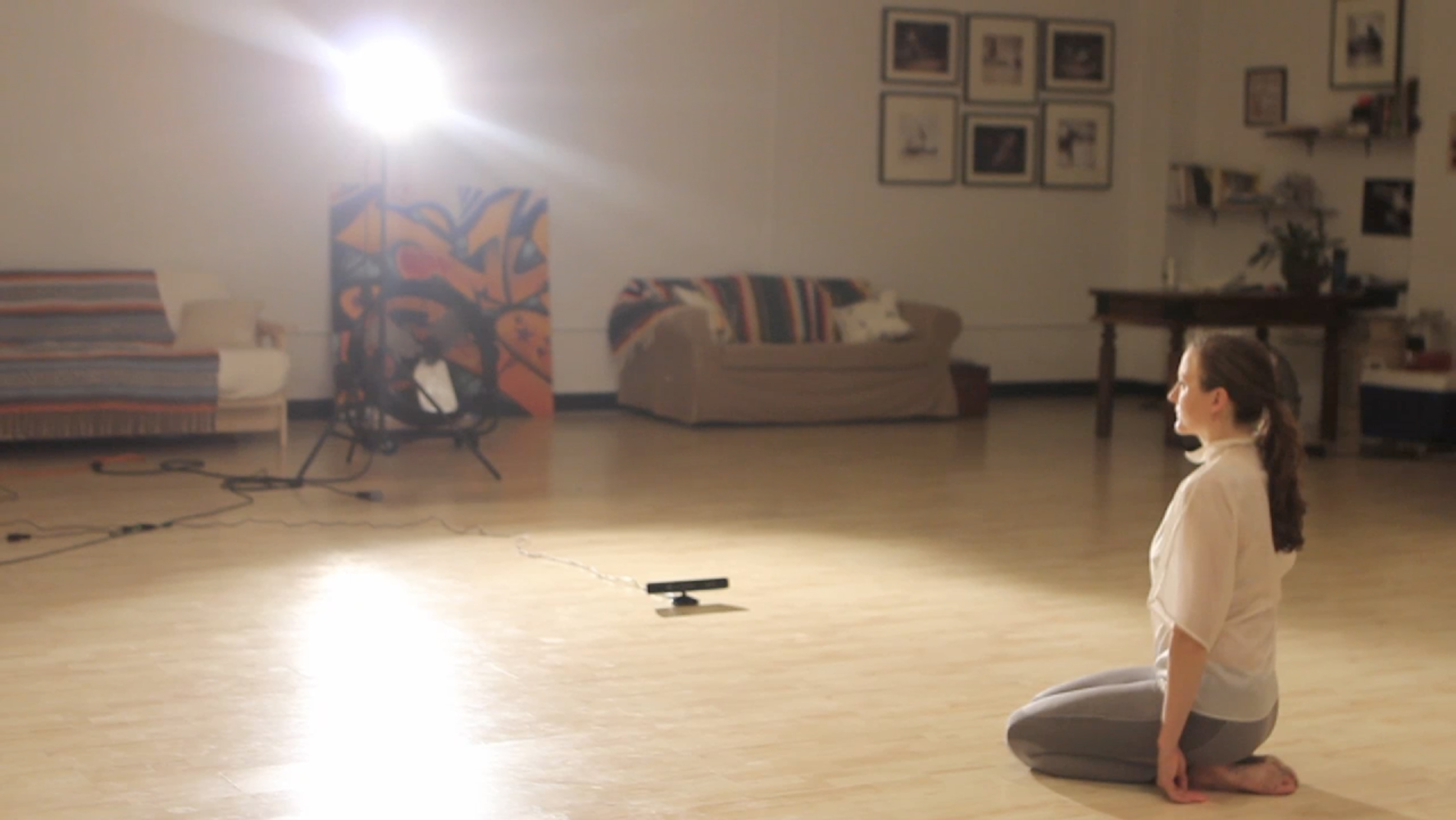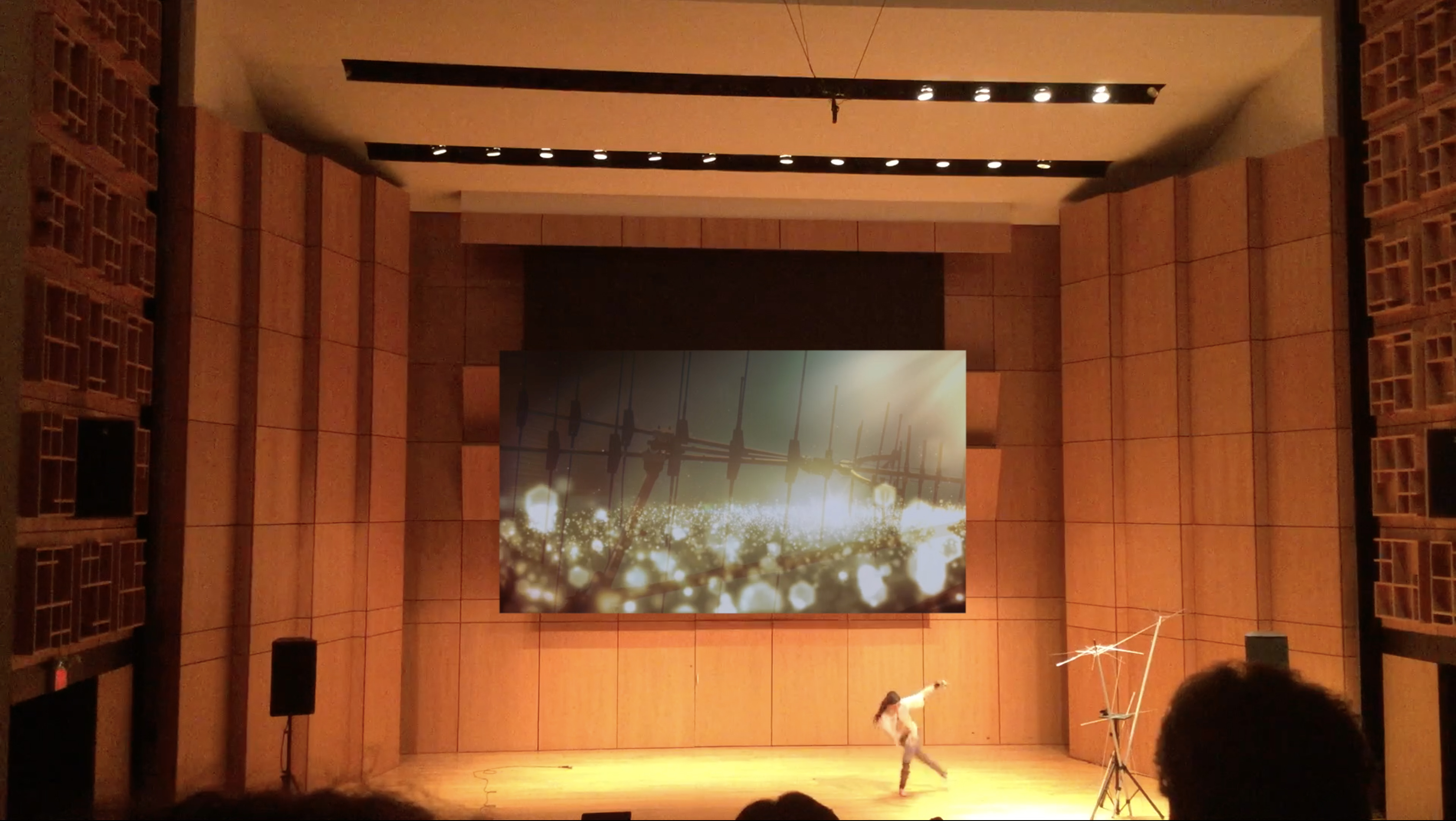 The movement from Emily is captured with the Kinect camera and outputted to a visual programming environment for multimedia systems that Knoth has developed and customized. Through triggering sonic events and bending sound the space becomes an instrument that Emily can play. A confrontation of the self image surfaces and sinks in a compilation of interactive sound, recorded sound, and live sound. Imprints in form, movement, and sound guide the performer and viewer through Antennae.